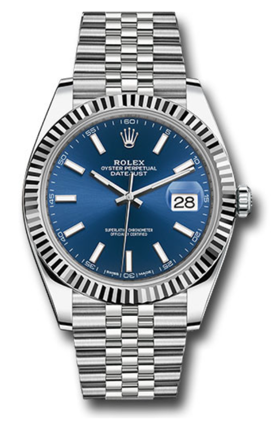 41mm white Rolesor case comprised of a 904L steel monobloc middle case, screw-down steel back, screw-down crown with twinlock double waterproofness system, 18K white gold fluted bezel, scratch-resistant double anti-reflective sapphire crystal with cyclops lens over the date, blue dial, index hour markers, Rolex calibre 3235 perpetual self-winding movement with date at 3 o'clock that changes instantaneously at midnight in a few thousandths of a second, approximately 70 hours of power reserve, 904L steel Jubilee bracelet with five-piece links, folding Oysterclasp buckle with Easylink 5mm comfort extension link. Waterproof to 100 meters.